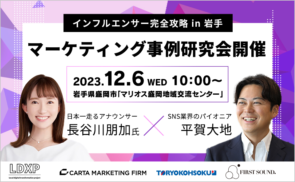 株式会社CARTA HOLDINGSのグループ会社で、マーケティング特化の事業を展開する株式会社CARTA MARKETING FIRM(東京都渋谷区、代表取締役:西園 正志、以下CARTA MARKETING FIRM)は、LDXプロジェクト*の一環として、株式会社ファーストサウンド(東京都中央区銀座、取締役代表:檜山 初音、以下ファーストサウンド)、杜陵高速印刷株式会社(岩手県盛岡市川目、代表取締役:西野 正寿、以下杜陵高速印刷)と共同で、インフルエンサー施策を学べるプレミアムイベント「マーケティング事例研究会~インフルエンサー完全攻略vol.2 in 岩手〜」を、2023年12月6日(水)10時00分より岩手県盛岡市「マリオス盛岡地域交流センター」にて開催します。