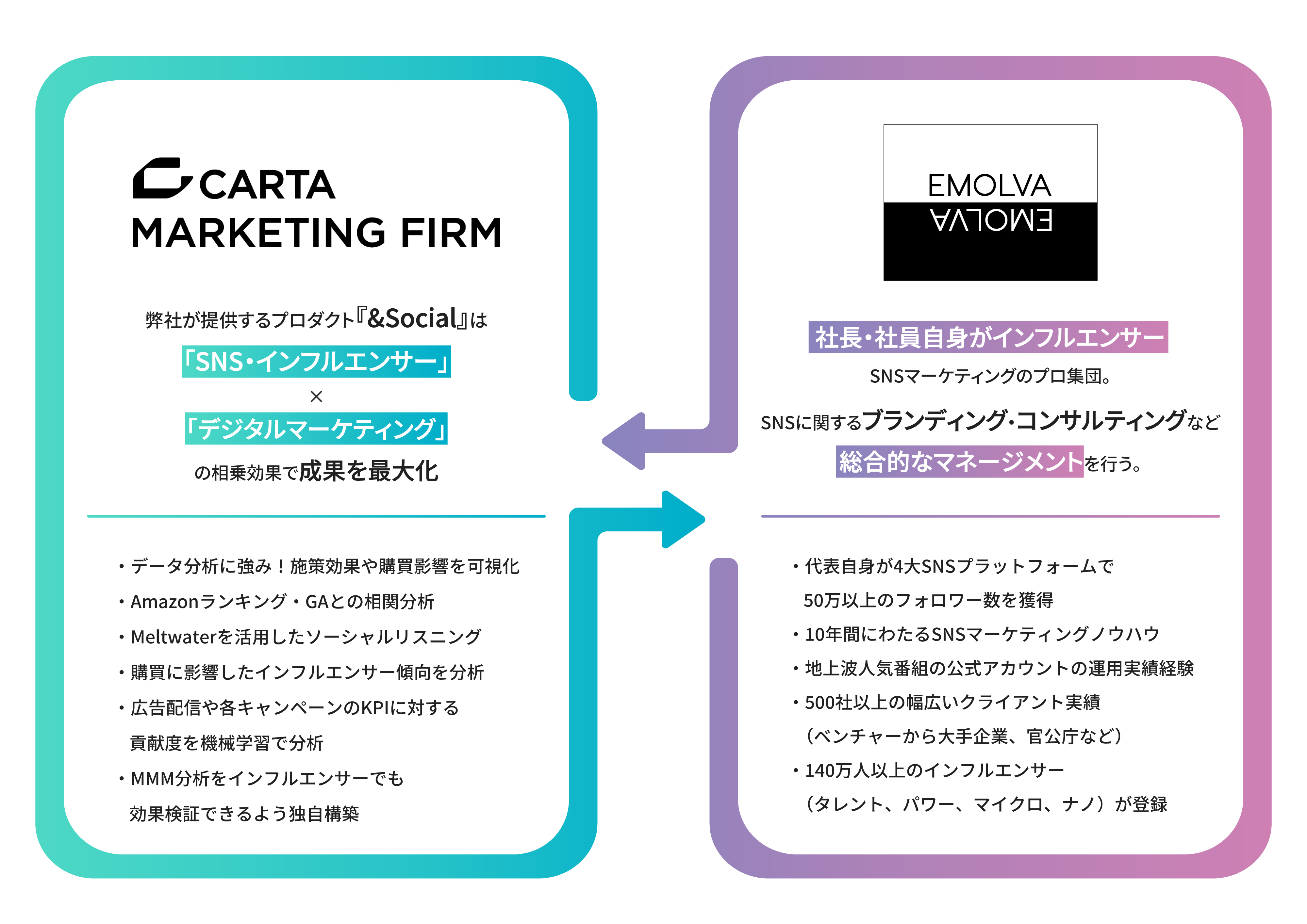 CARTA MARKETING FIRM、SNSマーケティングを展開する株式会社EMOLVAとパートナーシップ締結「データ分析力・専門知識」×「ブランディングノウハウ」~SNS戦略策定から運用・効果検証まで一気通貫。さらなる課題解決へ~