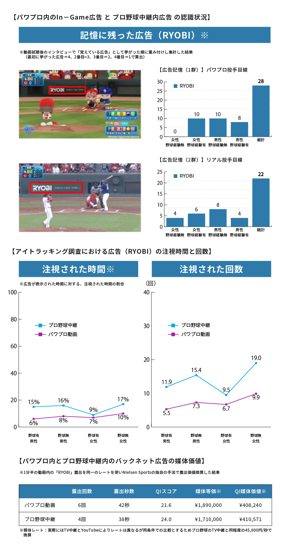 ゲームのプレー動画内に表示されたバックネット広告と、プロ野球中継のバックネット広告を比較した結果、注視時間や注視回数ではプロ野球中継のほうが多かったのに、「記憶に残った広告」でゲームのほうが中継を超えたんだ。ニールセンスポーツの分析によると、「5秒以上の表示は目が慣れ、認識力が大幅に低下するため、試合展開の速さから、画面切り替えが早いゲームは、広告露出が短く回数の多く記憶に残りやすかった」と分析されているね。