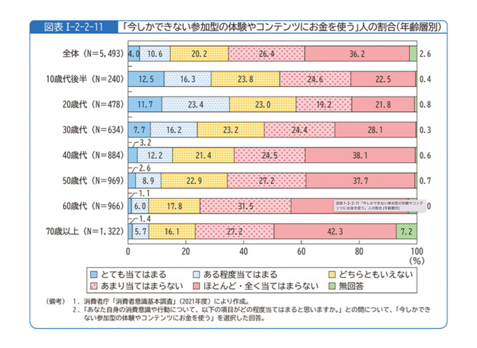 よく知ってるね!消費者庁の調査によると、「今しかできない参加型の体験やコンテンツにお金を使う」と回答した10代後半・20代は、他の年代に比べて高い割合だったんだよ。